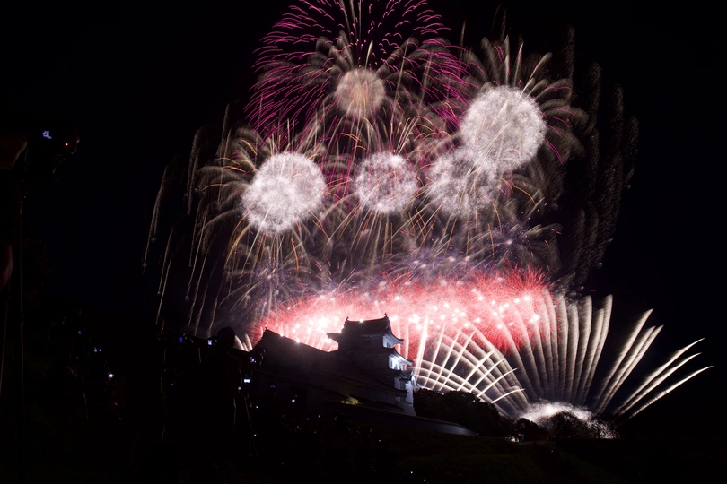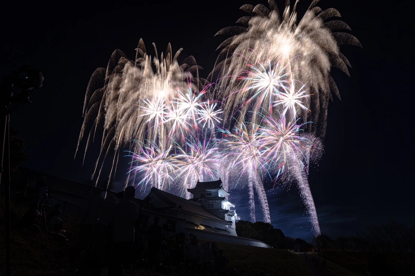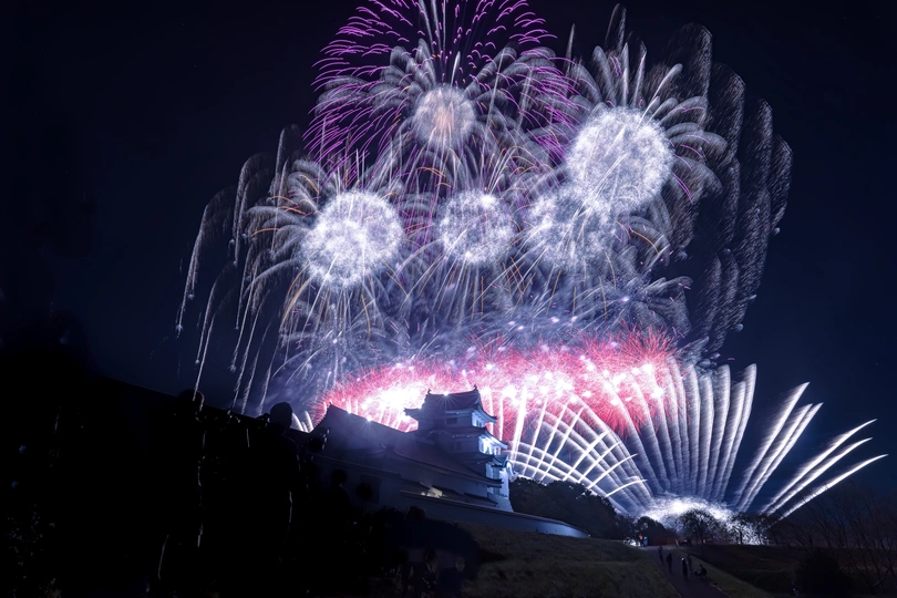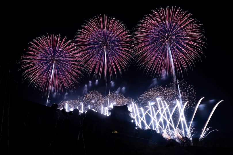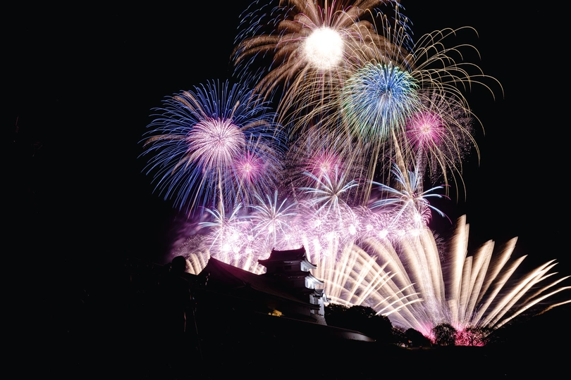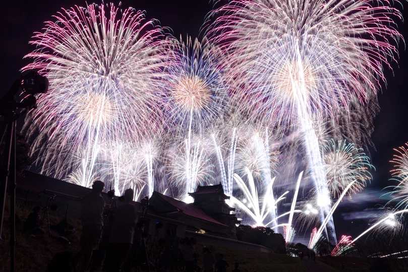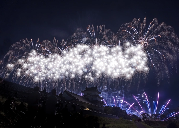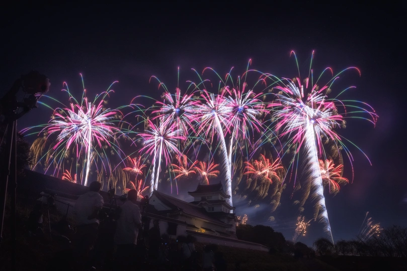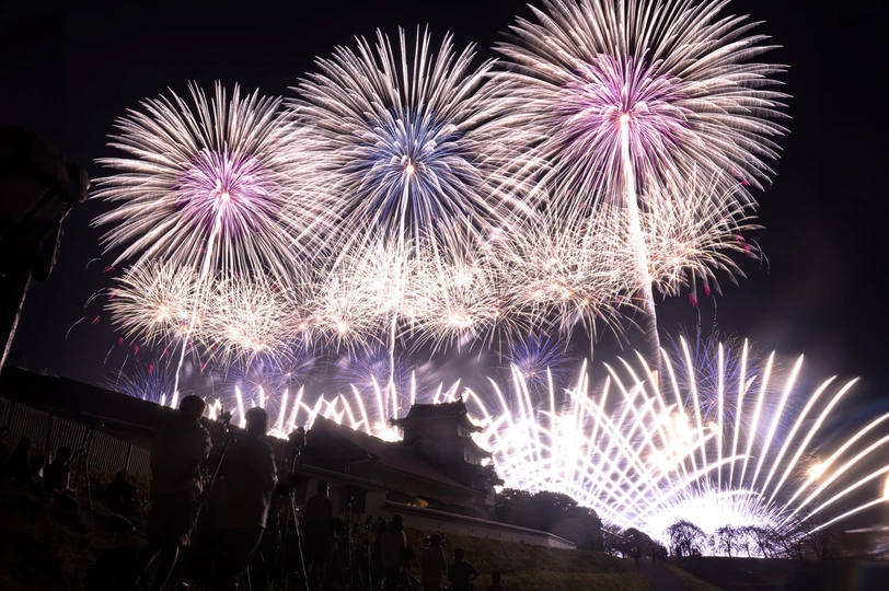 来自利根川花火大会的花火组图,前景为茨城県的関宿城。