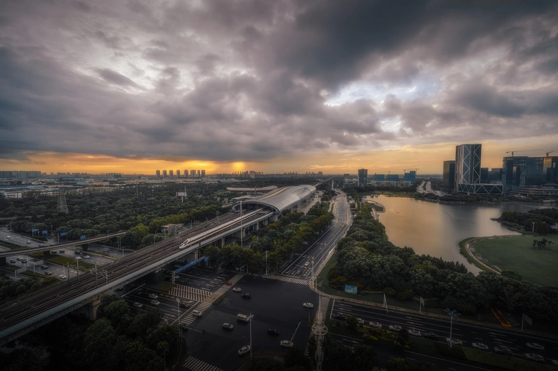 台风过后金光穿过云层拍到了晚霞与列车的同框🍃 尼康z62➕索尼14gm
