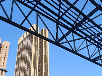 阳光照在城市里,蔚蓝的天空如幕布,高楼大厦的如格子般的玻璃窗上反射了天空的蓝、阳光的烈,好像一颗颗精雕细琢的蓝宝石,冷冽的色调更是凸显了城市的现代感。