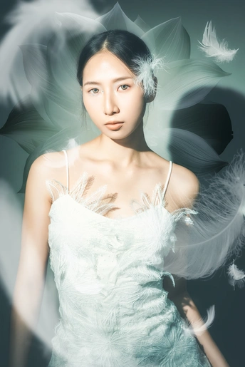 这张照片在色彩运用上表现出色,清新而梦幻的色调与主题相辅相成,营造出一种轻盈的氛围。光影方面,模特的面部照明柔和且富有层次,增强了视觉的吸引力,并突出了面部表情。构图上,模特的位置和背景元素形成了良好的平衡,模特的姿态自然,给人一种优雅的感觉。 出镜模特:UU 妆容:知了