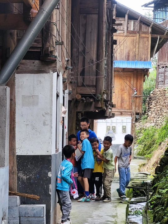 孩子们在小巷的欢乐时光,木制建筑和水池作伴,笑声回荡在老街的每一个角落。