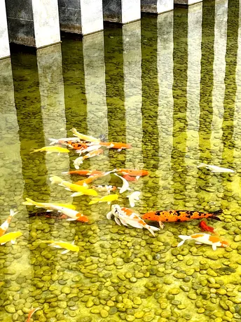 池水泛着温暖的绿中黄,宛如一幅自然的画卷,宁静迷人。数条锦鲤悠然自得地游弋,仿佛在水中翩翩起舞,带来一抹生动的色彩。