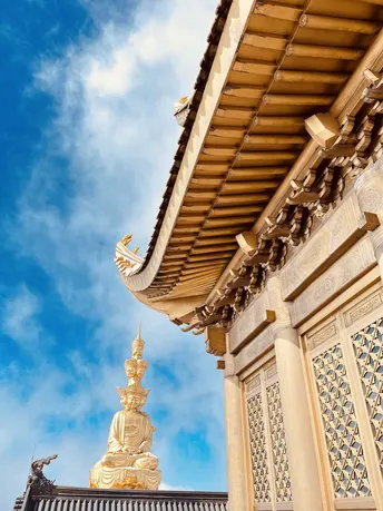 峨眉山冬日的阳光洒落在这座神圣的山巅,金佛像巍然屹立,金光璀璨,犹如冬日里的明珠,散发着温暖而宁静的光辉。金庙屋顶在阳光下熠熠生辉,湛蓝的天空如洗,清澈而广阔,映衬着这片神圣的土地,令人心生敬畏与向往。在这冬日的峨眉山,信仰与自然交融,仿佛时间在此刻静止,让人沉浸在无尽的美丽与宁静之中。