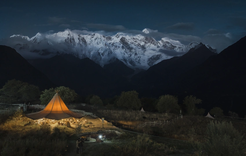 夜幕降临,点点星辰开始闪烁。太阳的余光照耀在南迦巴瓦的白雪之上形成了反晨!我果断拿出相机记录下了这一时刻。