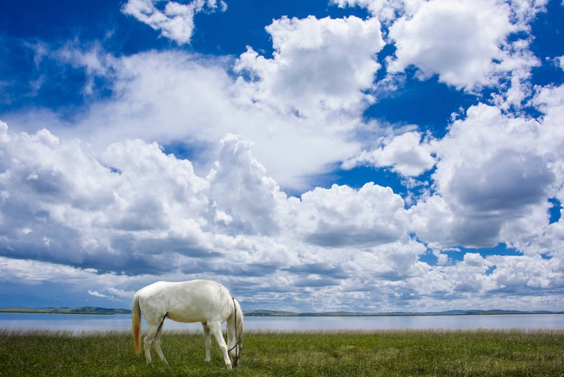 这张照片展示了一个白色的马在宽广的自然环境中,色彩鲜明且和谐,蓝天和白云的对比增强了视觉冲击力。通过良好的光影处理,马的轮廓清晰可见,与背景的云层形成了鲜明的对比,使得主体更为突出。构图方面,马位于画面的前景,而天空则占据了大部分画面,形成了一种开阔的空间感,这种布局使观众的目光不自觉地聚焦于马及其周围环境。 在后期处理上,照片色彩饱和度适中,整体效果自然,而非过于夸张。尽管如此,如果光影的对比度更加明显,可以使得马的形象更加立体。主题原创性方面,白马的形象和自然景观常见,但这张照片通过构图和色彩提升了主题的吸引力,带来了视觉上的新鲜感。 若尔盖草原宛如一块镶嵌在川西北边界上瑰丽夺目的绿宝石,素有"川西北高原的绿洲"之称,是我国三大湿地之一。其行政区域包括四川省的若尔盖、红原、阿坝、松潘,甘肃省的玛曲、碌曲,青海省的久治等县,总面积约5.3万平方公里,总人口26.15万。
