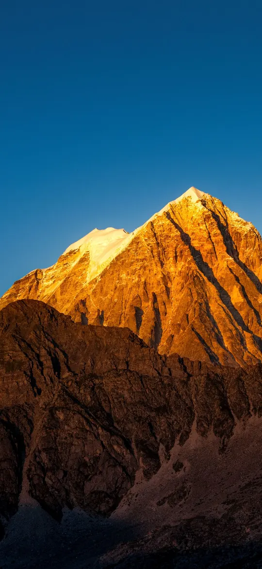 太阳临近地平线,黄金色的阳光撒向雪山!