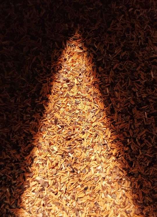 正午的阳光照射进房间,桌上晾晒的荞麦皮刚好形成了一个规则的金色等腰三角形区域。