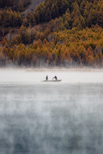 阿尔山乌苏浪子湖的晨雾,湖中央泛舟的渔民
