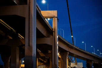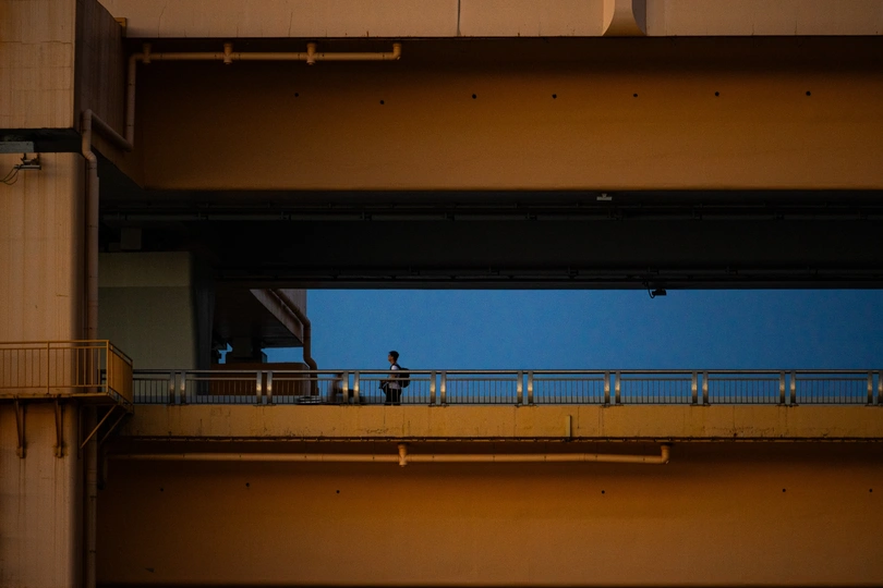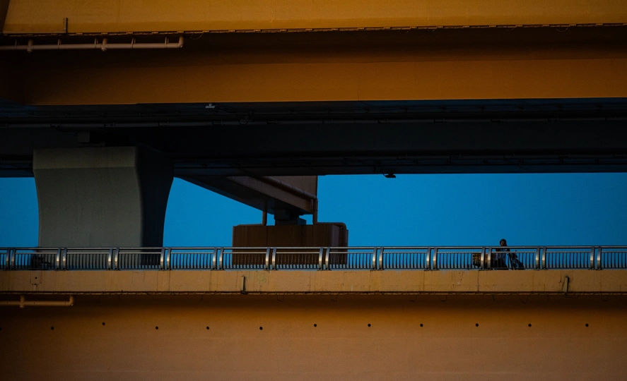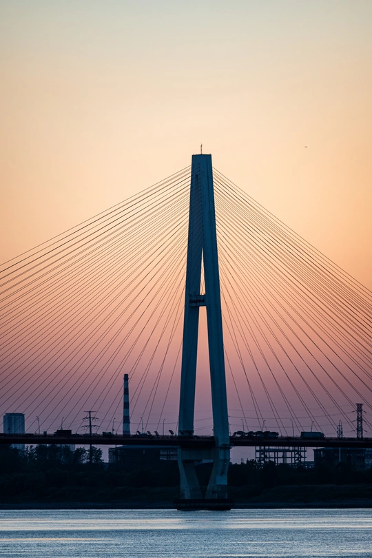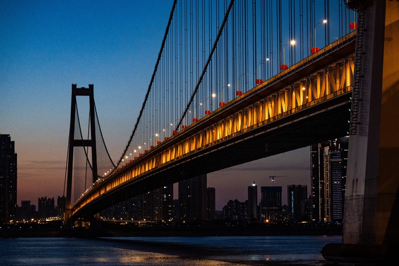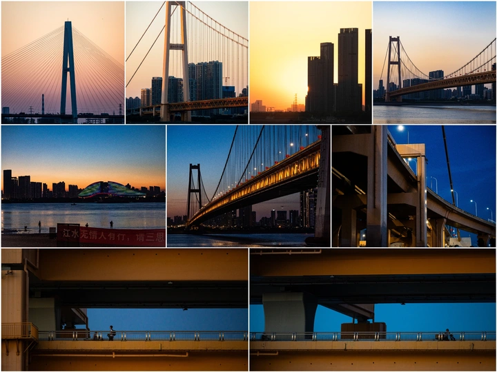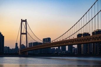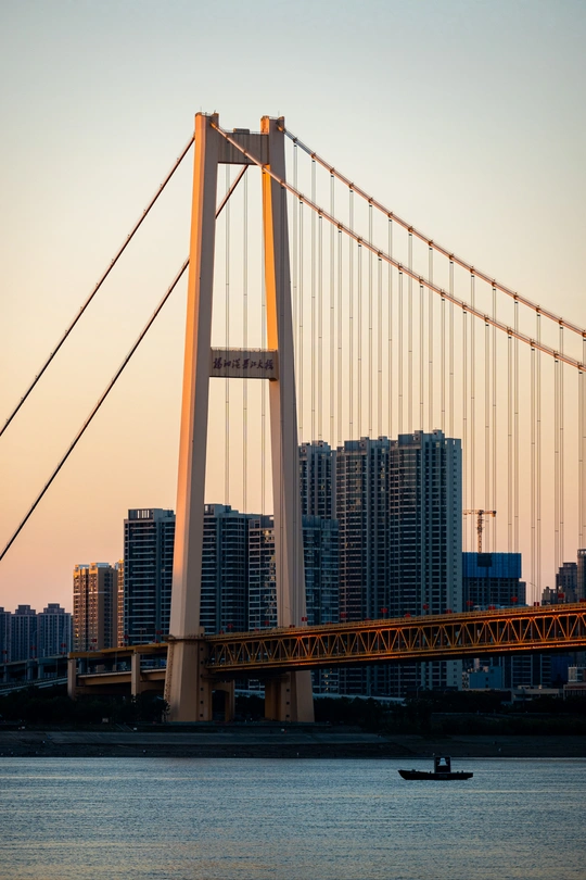 站在武汉杨泗港大桥旁边,观望江景,太阳即将落山,夕阳出来,迎接蓝调。