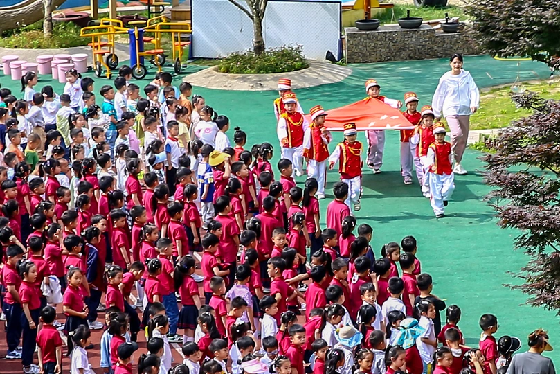 每个周一上午,楼下的幼儿园就有一个升国旗仪式,爱国,从娃娃抓起。