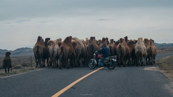 西北无人区沙漠骆驼与牧人