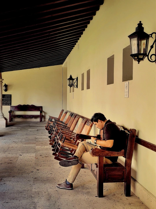 度假酒店大堂外部顾客休息处,人来人往,而这位男士却丝毫不予理会,聚精会神地盯着手机,似乎正在忙着非常重要的工作。
