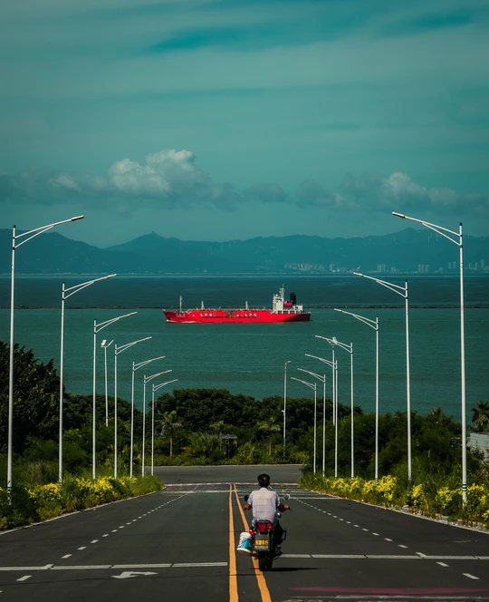照片是在汕头的娘惹岛附近。一条通向海边的尽头路,轮船驶过,大叔刚好不期而遇。