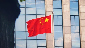 这张照片捕捉到一面中国国旗在现代建筑的映衬下飘扬的壮观景象。红色的国旗在蓝天白云的背景下显得格外醒目,象征着国家的尊严与力量。建筑的玻璃幕墙反射出周围的自然美景,与国旗的庄重形成鲜明对比,展现出一种和谐的现代美。
