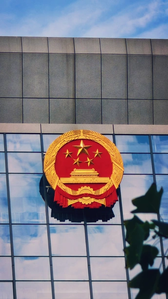 照片中,中国国旗的标志在建筑外墙上的金色光辉与玻璃幕墙上的蓝天白云交相辉映。标志上的三颗金色五角星和齿轮图案,不仅代表了国家的团结与进步,也与下方的红色绶带相得益彰,共同构成了一幅城市建筑与国家象征完美融合的画面。