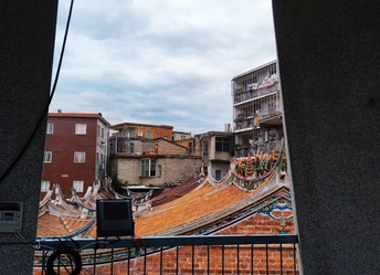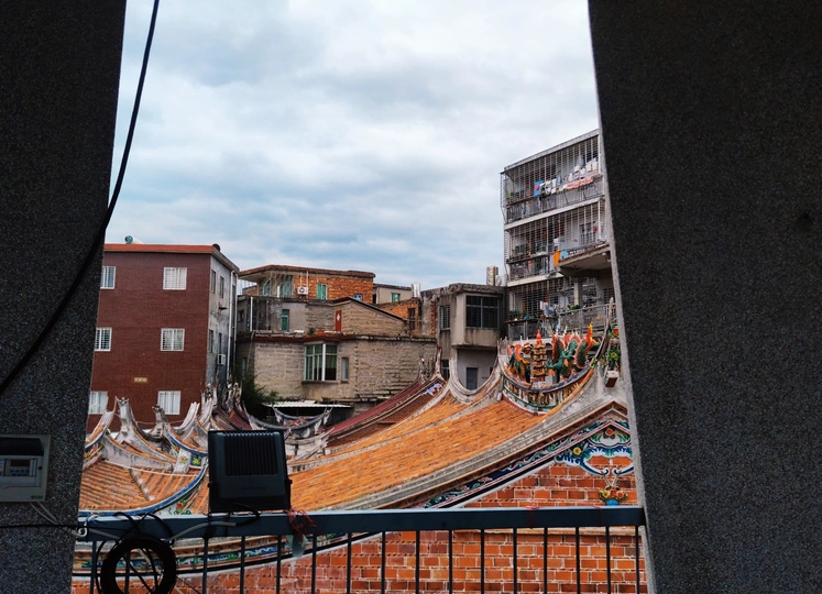 透过这扇窗,红色与灰色的砖墙建筑静静诉说着历史的沉淀。现代与传统的交融,就在这一角,静默而深刻。