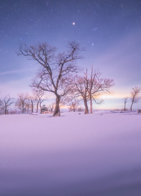 四方顶朦胧的月光打在雪地上,用改机拍摄的素材反而有一种粉色的奇幻氛围