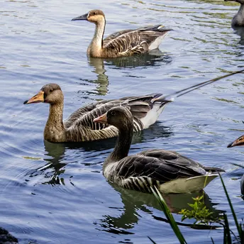 一群野鸭水面戏, 嘎嘎嘎嘎真欢喜。 你追我赶玩游戏, 快乐无忧笑嘻嘻。