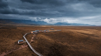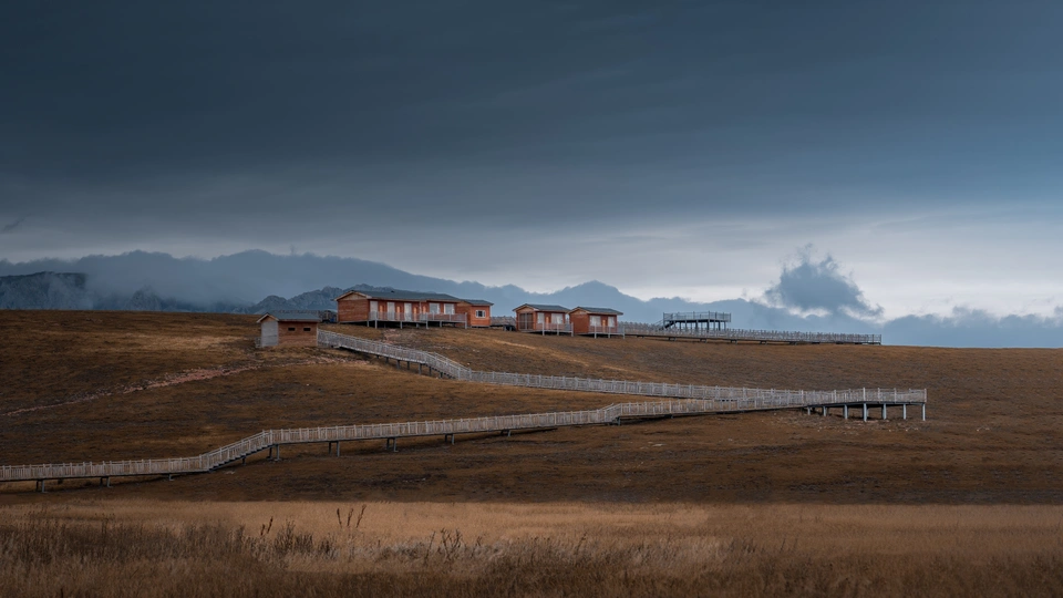 在去往兴错的必经之路345国道旁,广袤的草原上坐落着几幢小屋 ,在阴天里也能有不一样的风景。