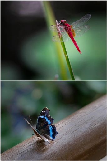 这组照片展现了自然界中的生动瞬间。 在色彩方面,红色蜻蜓的色调明快且饱满,鲜艳的红色和背景的模糊绿意形成鲜明对比,传达出活力和生命力。蓝色蝴蝶也十分具有视觉吸引力。 在光影方面,拍摄光源方向适当,光线透过翅膀,表现出细腻的纹理和光影效果。 构图方面,遵循三分法则,增加了画面的活力感。 后期处理上,图像调色适度,呈现较高的饱和度和自然的光泽感。 主题原创性方面,两张照片均展示了个体的自然美。 在情感共鸣上,蜻蜓给人一种生机与美丽的感受,能够引起观者的愉悦,而蝴蝶则较为静态,表达宁静的生命之美。 最后,思想深度方面,两张作品反映了自然中的生物多样性,蕴含深刻的生态思考。
