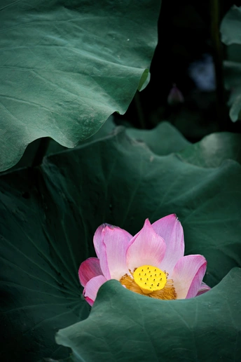 这幅莲花的摄影作品展现了较强的艺术性和专业性,整体表现优秀。 1. 色彩:色彩运用合理,莲花的粉红色与绿色的叶片形成了良好的对比,给人一种明快而清新的感觉。 2. 光影:光影处理得当,莲花的细节清晰,光线从适当角度洒落,使得花瓣的纹理和结构得到很好的展现。 3. 构图:构图简洁,下部的叶片很好地框住了莲花,形成了一种聚焦感。 4. 后期处理:后期处理合理,图像整体清晰。 5. 主题原创性:莲花的主题在摄影作品中常见,但这幅作品通过独特的角度和框架展现了花的灵动与生命力,令其具有一定的原创性,能够引发观者的思考。 6. 情感共鸣:作品传达了自然的宁静和美好,观者容易产生共鸣。色调和构图表达一种孤独或生命的脆弱,十分具有打动性。 7. 思想深度:从造型和表现来看,作品初步展示了对生命的赞美。