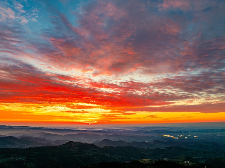 在成都,如果要观看日出那必然是龙泉山。如果都到了龙泉山,那必然要上到最高处——凉风垭。成都的东面,东部新区简阳方向,层层山峦,仿若一副成都版的千里江山图,俯瞰视角下的龙泉湖随着日出、朝霞的光芒渐染成大片金色。恰如其分的完美诠释——湖山拂晓时,追光龙泉山。如果有人问成都观看日出以及朝霞的地点,那一定是凉风垭。