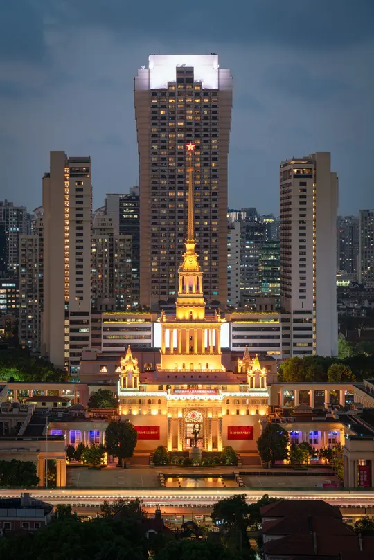 终于拍到了展览中心最佳机位! 图中金色的是上海展览中心建成于1955年,原名“中苏友好大厦”,是上海的代表性建筑之一,也是50年代上海市建造的首座大型建筑,俄罗斯古典主义建筑风格。塔尖上的五角星在阳光照耀下熠熠生辉,光辉永存!