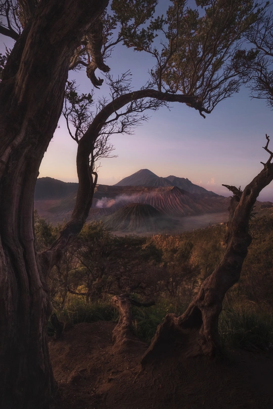 拍摄于印度尼西亚 布罗莫火山,日出前微弱的光将天空染成紫红色,我寻找了一棵火山前的树作为框架构图当前景拍摄了这张照片