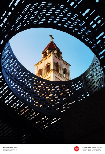 红顶金辉粉色教堂,蓝天映衬显庄严,圆环环绕古今融,美景交融韵味长。
