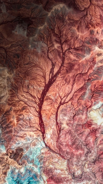 在甘肃平易河收费站附近,我将无人机升起,无意间发现河流在大地上冲击出一道道沟壑,由于地质原因这些沟壑呈现深红色,我选择了其中最具代表性的一条按下快门