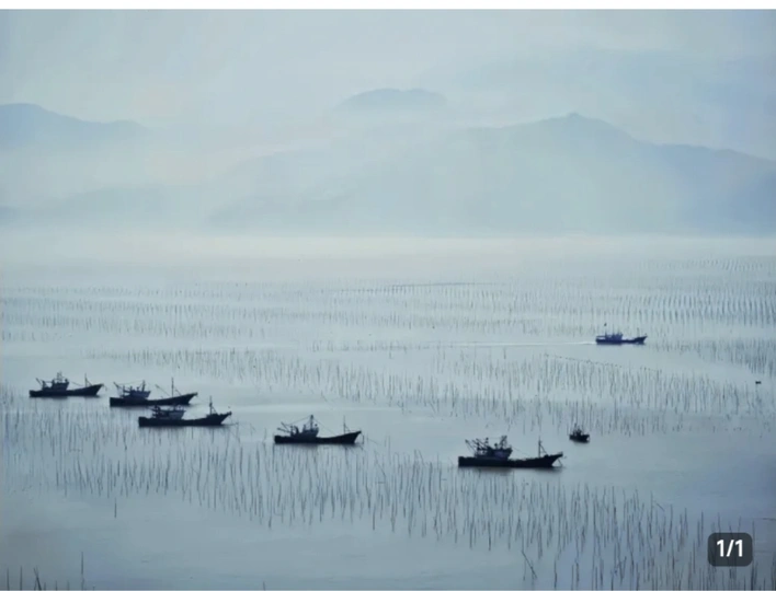 🍺题材来源: 在早上与朋友相约驱车赶往海边浴场的路 上,途经一个海鲜养殖场时,看到此景,随停下拍摄记录下来。 🍻作品表述: 远处的山在还没有完全褪去时,朦朦胧胧若隐若现,犹如一幅水墨画,近处一艘艘停在渔场中的小渔船右向左呈对角式有秩序排列,而此时又有一艘渔船横着驶入渔场,身后划岀一道水迹,给画面增添了一些动感,在它走到右角时拍了下来,这样又失整洁有序。 🥃总结: 当时只想到这样的构思,水平局限,需要进步提升。