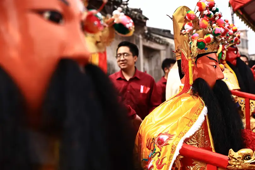 在拍摄民俗活动时 ,拍到了一个当地居民正好位于两个当地供奉的神仙之间的画面,此情此景,不禁令人感到万物间的相生相克,相依相斥