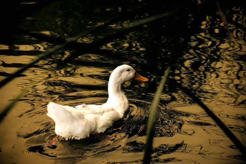 湖水被夕阳染出橙色,如同一面巨大的彩镜。 那温暖的橙色光芒,在水面上闪烁、跳跃。 白鸭在水面画出涟漪,它们欢快地游动着。 脚掌拨动湖水,涟漪一圈圈荡漾开去。 橙色的湖水与白鸭的身影相互映衬, 构成了一幅生动而美丽的画面。