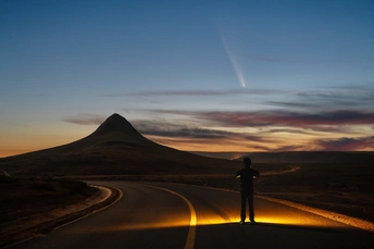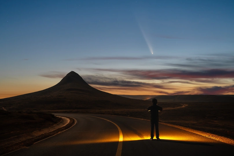 #紫金山彗星 即将迎来最后的辉煌。 每一颗彗星都是一只知了,用六万年冬眠换短暂的绚烂。谁曾想到,上次他与这座火山相遇时,这里还喷发着岩浆,如今已铺好了公路。 #仰望星空 #火山 #旅行