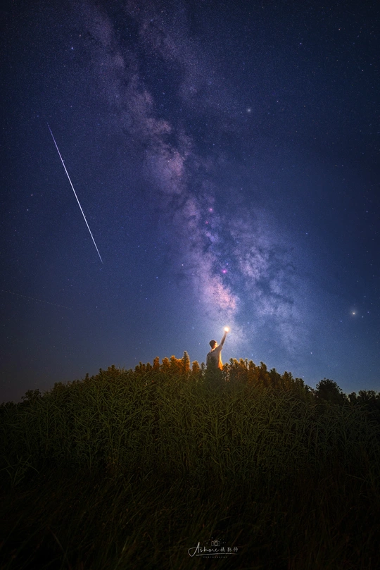 2023年7月底,我在上海崇明岛拍到了唯美的摘星少年,恰巧一颗流星划破天际。