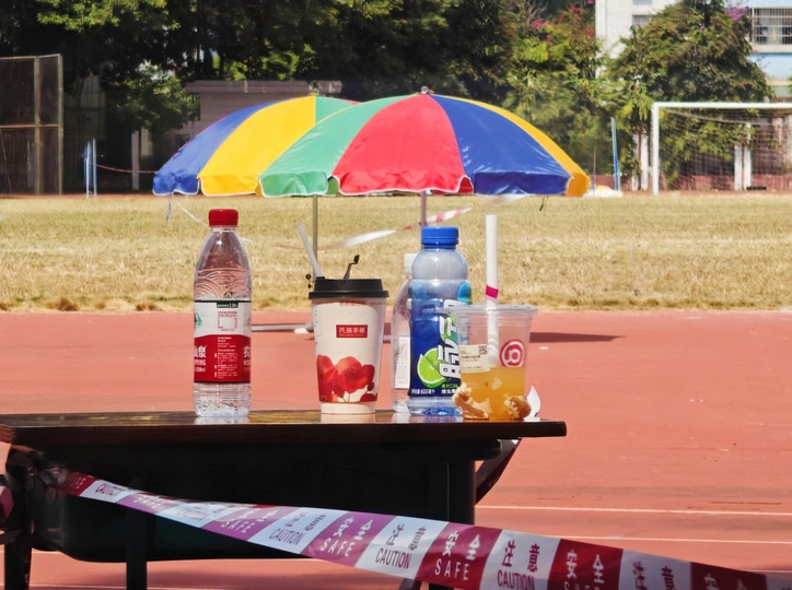 正值运动会盛大举行,午后漫步间,目睹了这令人惊叹的情景。原本为工作人员提供庇护的大伞,此刻,靠近我这一侧的饮料亦需寻求遮蔽,仿佛一切都充满了生命与意识。