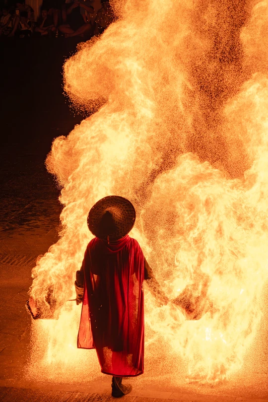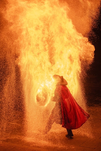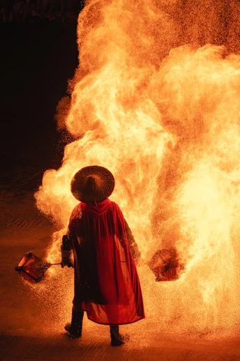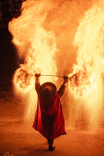 火壶表演是一种将操纵火焰的技巧与艺术相结合的表演形式,通过将烧好的木炭放入两边的铁网抖动产生火花,形成震撼的“火树银花”场面,寓意驱疾避祸和百家安宁。