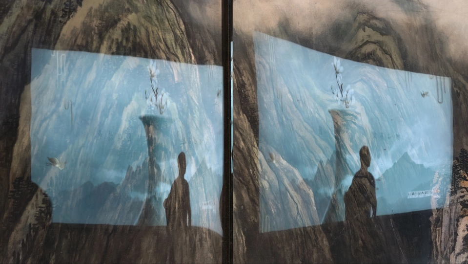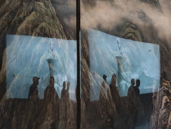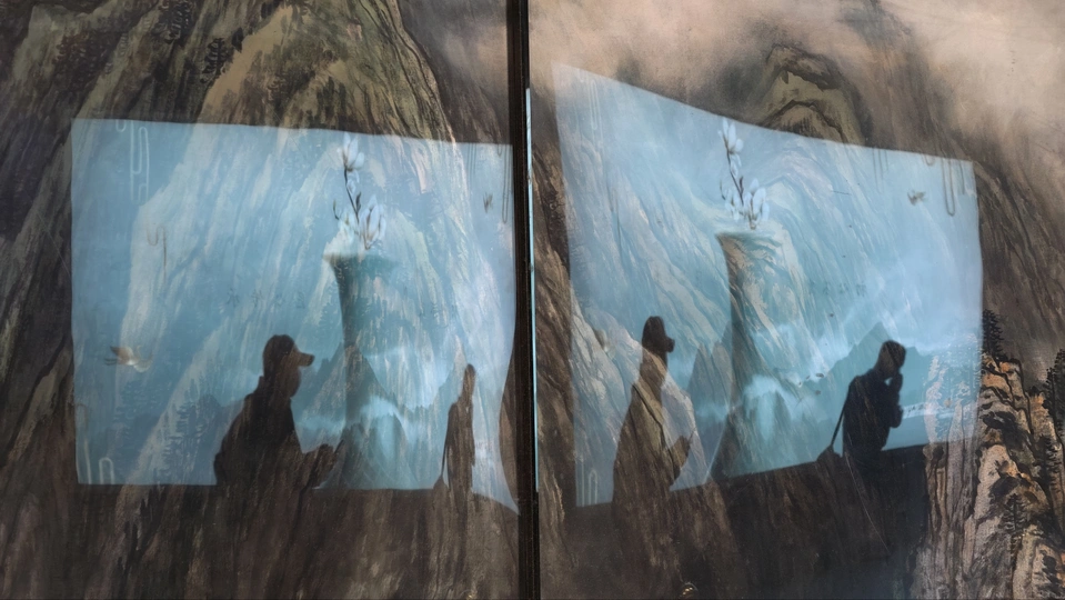 在走出机场的长廊上,两侧的广告灯箱相互反射着对面的画面,旅客在中间不停地穿梭而过,呈现出独特的场景,于是用手机拍下这组画面。