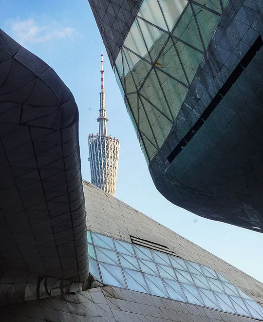 广州大剧院中藏着一个广州塔机位 走到大剧院这条小路小路便可以看到这个夹缝生存的广州塔