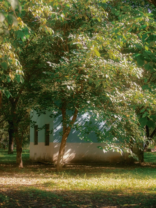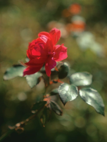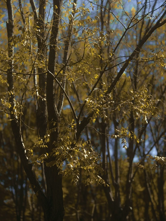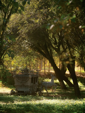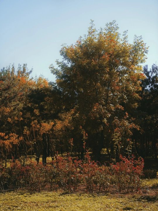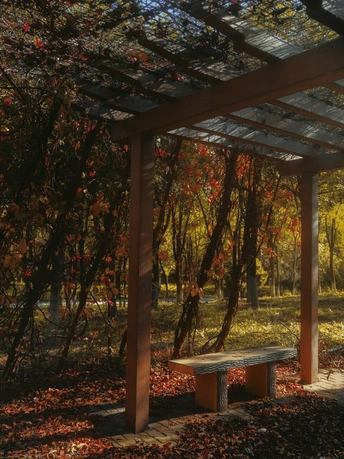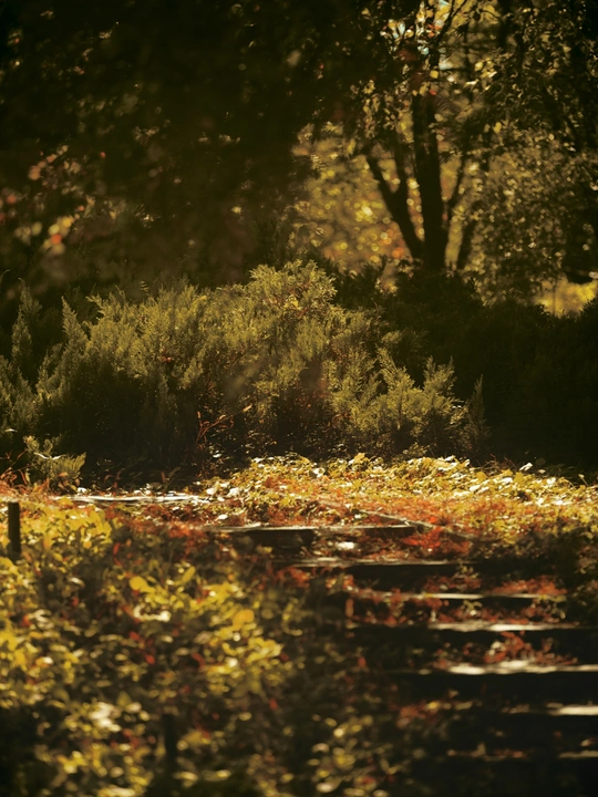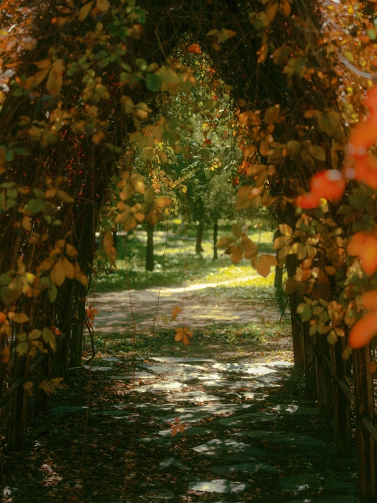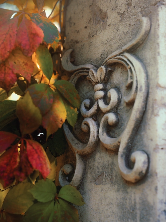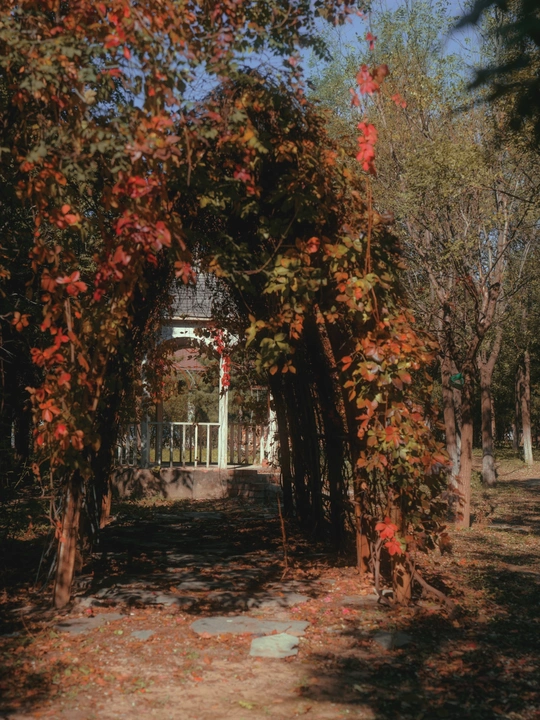 美丽的叶子缠绕着屋顶 像一顶王冠 天上的白云 是落叶的伴侣 秋天 是一位伟大的诗人 . 摄影/后期:春心未书 . 难得好天气,背着相机就出去了,这次游览的地方是东风公园。 . 这是一座比较安静的公园,由于设施维护,游人不多。欧式废墟旁的风车不知什么时候拆掉了,从废墟的围墙上望过去,远处是一些月季,热烈而深沉,泼泼洒洒,秋风中正开的烂漫。 . 公园一共有四个区域,一进门有青黄相间的树林,林中有爬满红色爬山虎的小亭子,接下来是欧式废墟和月季,再往远处会遇见一辆童话绘本里走出来的石膏马车,马车旁是一座蓝色的房子。穿过树林深处的池塘会看到一片红黄相间的树林,红色爬山虎下的长凳上,树影斑驳,像新海诚爱画的地方。 . 一口气穿过了三片树林,像靠近了一个郁郁葱葱的秘密。 .