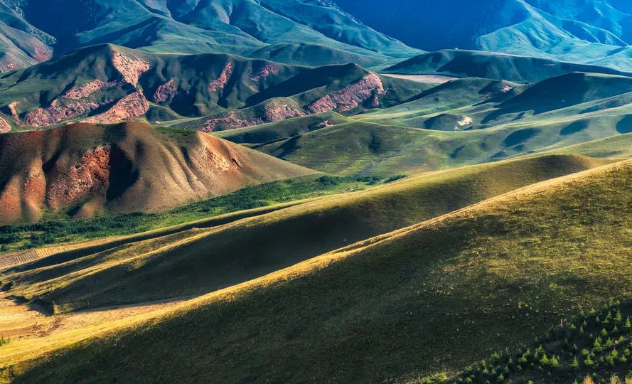 每当阳光普照大地,山脊线就会被光影延伸,棱角分明的山峰也偶尔带上了金边