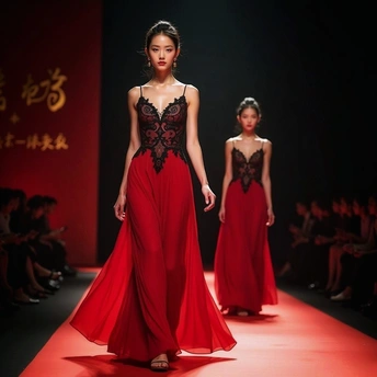 AI点评: 照片展示了模特在时尚秀场上的精彩瞬间,整体效果突出,红色礼服在黑暗背景的衬托下显得尤为鲜明,光线的运用非常成功,背景的柔和黑暗与模特身上的光斑形成了鲜明对比,突出了主体的立体感。