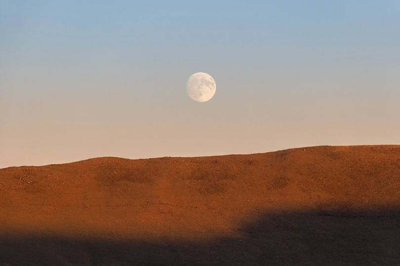 傍晚月升太阳落,余晖透过对面的山留下阴影组成一副宁静的画