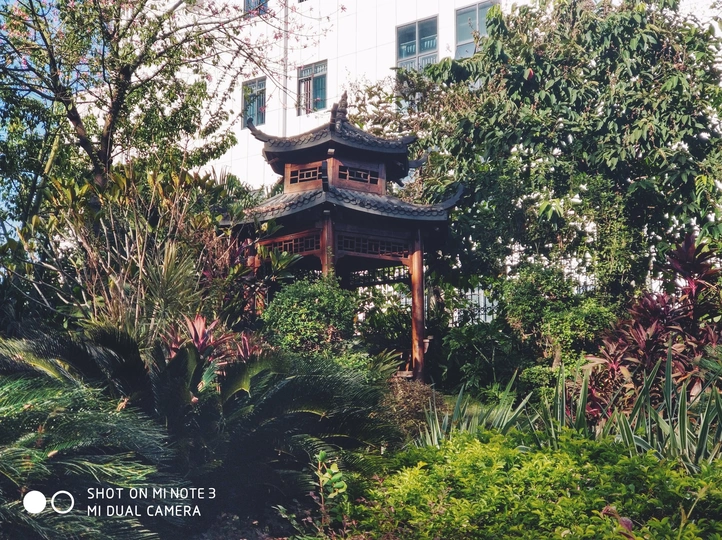 公园里供人休息的亭子,隐藏在花草树木之中,有一种古朴典雅的美感。