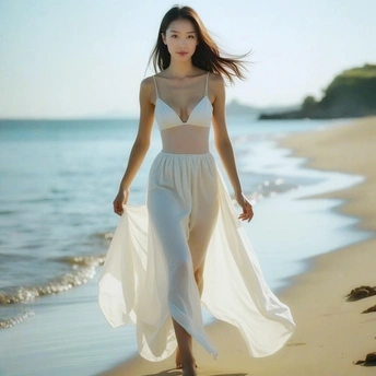 AI点评: 照片整体色调柔和且符合夏季氛围,人物的白色服饰在蓝色海洋和沙滩的衬托下显得非常清新,自然光线很好地勾勒出了人物的轮廓。