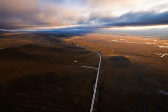 这张作品是在内蒙古呼伦贝尔莫日格勒河畔拍摄的一幅大草原风光照,清晨时分使用无人机从高空俯瞰,呈现了草原的广袤无垠与河流的静谧蜿蜒。作为一名摄影师,我始终希望通过镜头捕捉自然最纯粹的瞬间,而呼伦贝尔的辽阔与沉静为我提供了一个绝佳的创作舞台。莫日格勒河以其曲折流动的水道而闻名,它像是镶嵌在草原上的一条丝带,将这片广袤的土地点缀得生机盎然。 拍摄这张照片前,我在草原上度过了好几天,为了能够等到一个理想的光线和天气条件。草原的天气瞬息万变,清晨的第一缕阳光突破云层,柔和地洒在大地上,使整个画面瞬间充满了温暖的色调。我选择在无人机的高空视角下拍摄,不仅展现出河流的蜿蜒与曲折,也将远处的山峦和笔直延伸的公路一并收入镜头中。这种纵深感让人感到草原的广阔无边,仿佛一眼望不到尽头。 在这幅作品中,光影的运用尤为重要。朝霞的温暖光线为画面带来了细腻的层次感,阴影部分则增加了作品的立体感和深度,使得每一座小丘、每一条车辙都清晰可见。公路在这片大地上延伸,与自然的曲线形成了一种有趣的对比,既展现了人类在大自然中的痕迹,也让人感受到天地的无垠。这种对比不仅是视觉上的,也是情感上的,让人产生一种人在自然面前渺小但