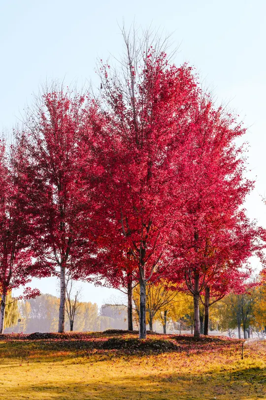 在一片片金黄色的枫叶中屹立着几棵红色到枫树,满满的晚秋气氛,微风飘过,叶子在空中划过,温馨且悲凉。