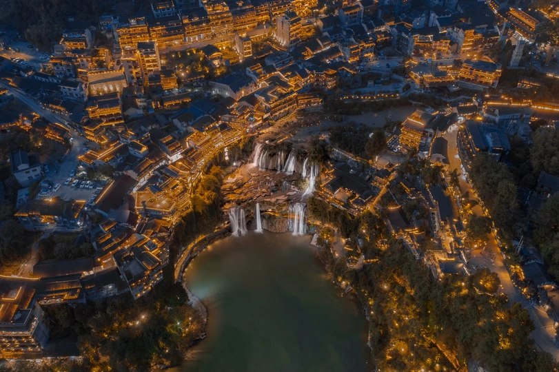 芙蓉古镇夜幕降临时,无人机升到空中俯视地形,小镇的建筑群就像环抱中间被灯光照亮的瀑布。在地面操控无人机,周围游客人声鼎沸,以及瀑布从高处落下的水流冲击,两种音量不小的声音充斥在耳边,和屏幕里相对安静的画面形成独特和奇妙的反差。 使用御2pro拍摄,多张堆栈+包围曝光,后期合成。