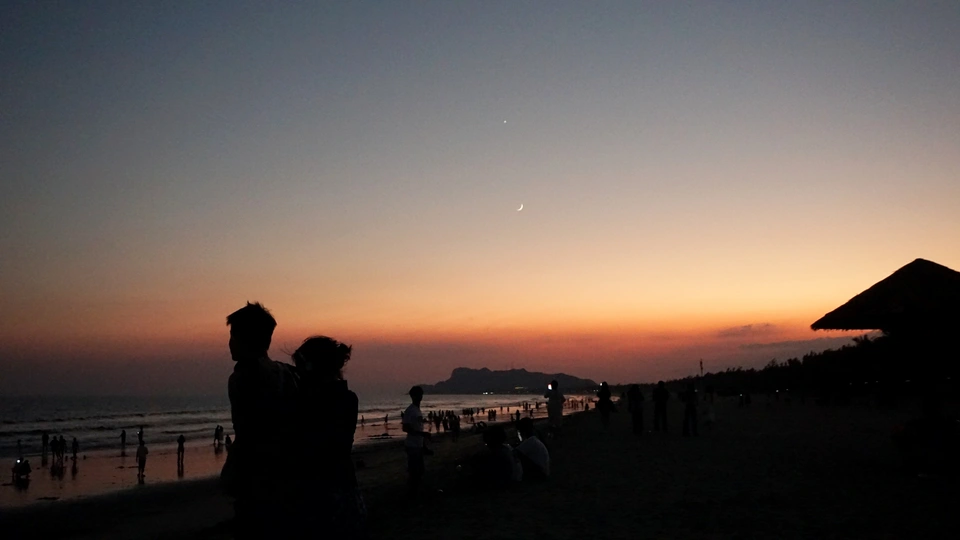 这张照片展示了一个海滩日落的场景。天空呈现出美丽的渐变色,从深蓝色逐渐过渡到橙黄色和红色。月亮已经升起,挂在天际线上方。海滩上有很多人,有的在散步,有的在拍照,还有一对情侣紧紧相拥,似乎在欣赏这美丽的景色。远处可以看到山脉的轮廓,整个画面充满了宁静与浪漫的气息。