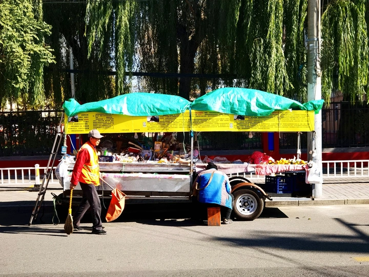 正当中午,秋日阳光火辣。一路边推车出摊儿的摊主,又困又饿又乏坐着睡觉了。正好旁边一环卫工人在扫大街。都市里为了生存奔波辛苦的底层人们。